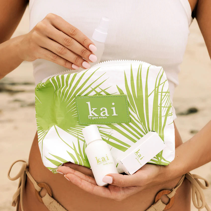bring a little paradise wherever you go. this set (valued at $129) includes your kai favorites: full-size signature perfume oil, mini signature body glow, and mini signature body lotion, all tucked inside a special edition kai x ALOHA Collection pouch. designed with ALOHA’s signature Splash-Proof® fabrication, this lightweight, water-resistant pouch is packable, easy to clean, and perfect for travel. think white florals with notes of gardenia wrapped in white exotics, warm sand, and a soft sea breeze.