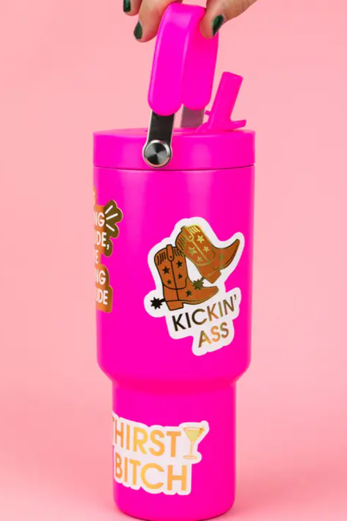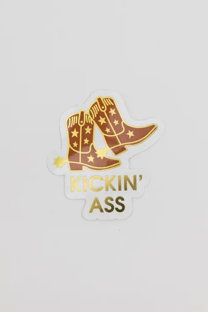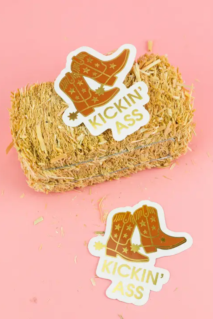 For the days when you’re getting it done and looking damn good doing it. Our Kickin’ Ass vinyl sticker features a pair of star-studded cowboy boots with luxe gold foil accents — the perfect little yeehaw of motivation for water bottles, laptops, notebooks, or anywhere that needs a reminder of just how hard you’re crushing it.