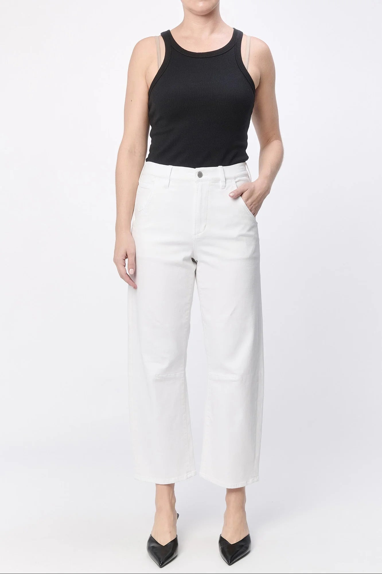 The Lasso loose straight leg barrel fit in Summer White, a chic high-rise design featuring a clean hem and crafted from a premium blend of white denim for the perfect balance of comfort and style.