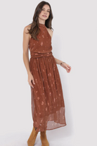 Step into effortless sophistication with the Last Dance Tieback Midi Dress. Designed in a rich brown multi print, this timeless silhouette features a sleek halter neckline and a flattering midi length that moves with ease. The elegant tieback detail adds a refined, feminine touch, making it the perfect choice for special occasions, evening outings, or any moment you want to stand out.