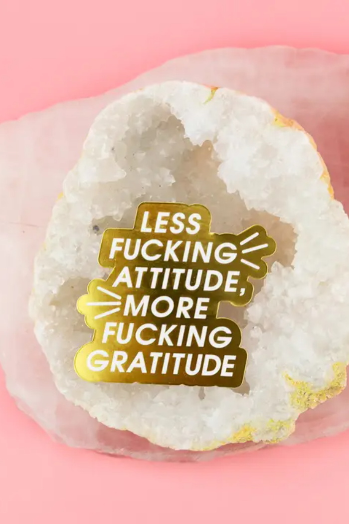 A reminder we all need… delivered the Chez Gagné way. Our Less Fucking Attitude, More Fucking Gratitude vinyl sticker brings bold energy with its shiny gold finish and clean white lettering. Glossy, waterproof, and accented with luxe gold foil, it’s the perfect daily mantra for water bottles, laptops, notebooks, mirrors, and anywhere else a little perspective (and profanity) is appreciated.