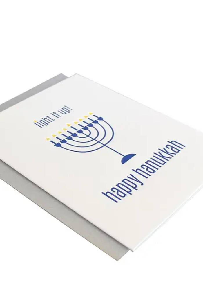Our “Light It Up Hanukkah” card is letterpress printed on a vintage printing press in sunny California. Featuring festive blue and yellow ink on bright white cotton paper, this card comes paired with a luxe silver envelope for a celebratory touch.