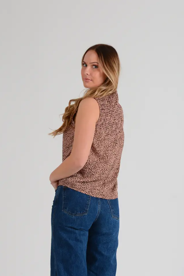 Perfect pre fall top to transition into fall. Expertly crafted, this mock-neck sleeveless blouse top features a smock pleated yolk design on both the front and back. With meticulous attention to details, this top exudes a professional and polished look. Stay stylish and comfortable in this modern and versatile blouse.