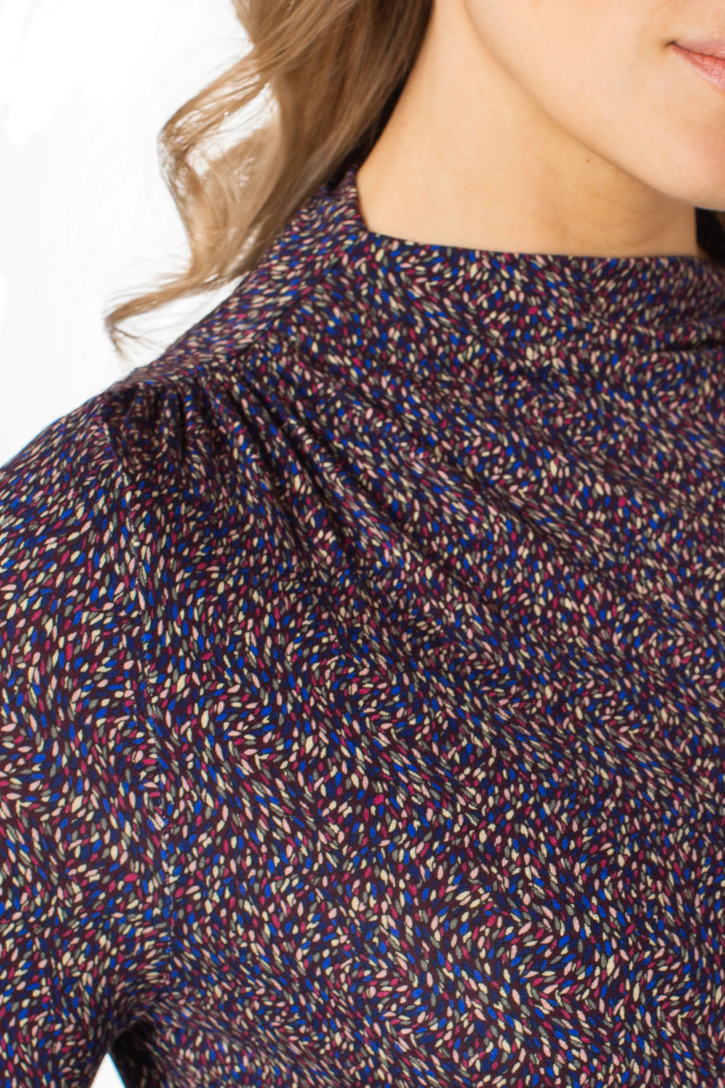 This long-sleeve knit top features a sleek mock neck and artful shirring at the shoulder and hip, creating a softly draped, flattering silhouette. Perfect on its own with denim or layered under tailoring, it’s finished with a statement print that completes the look.