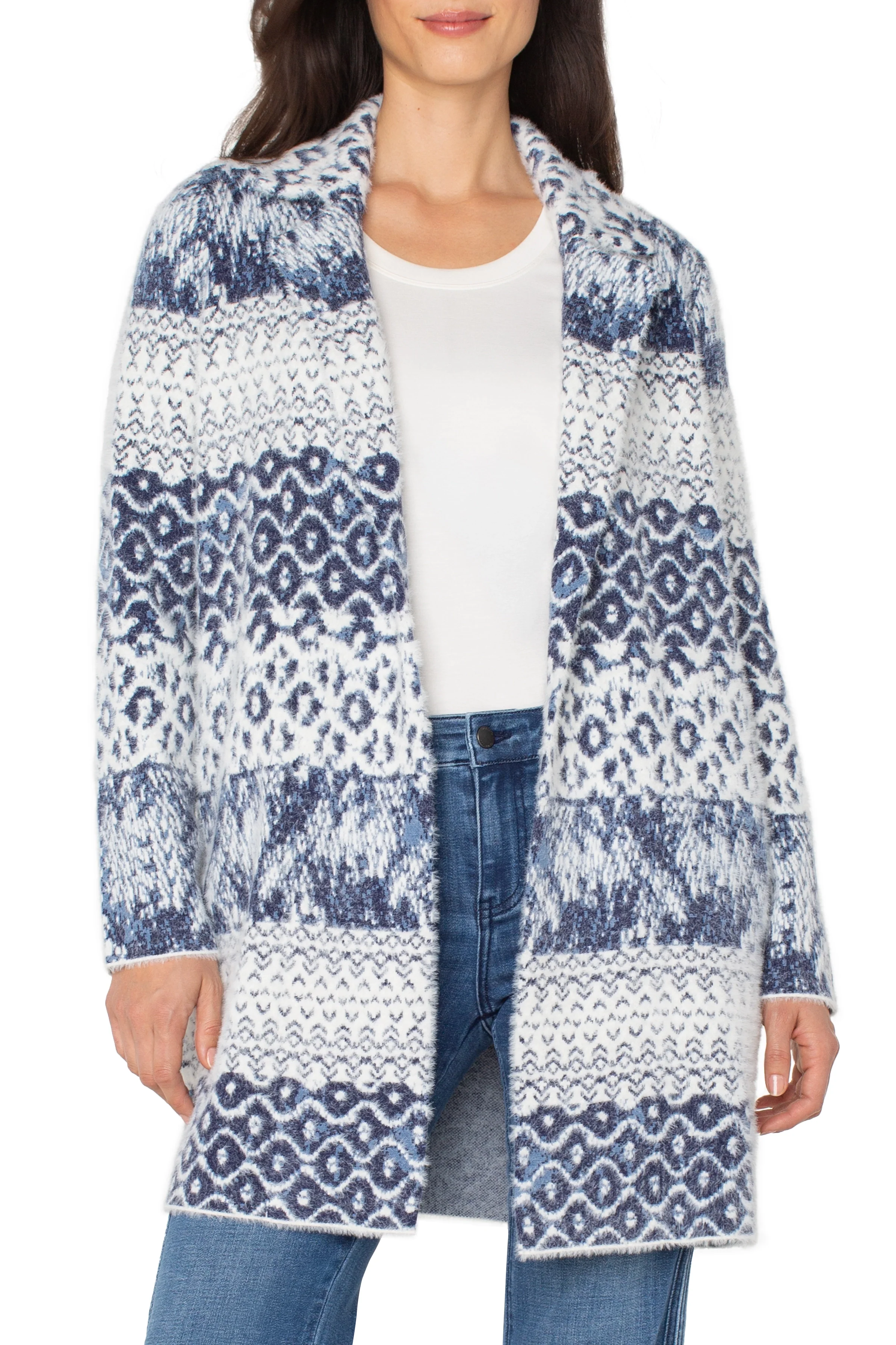 In a navy shibori print, this open-front coatigan is the perfect balance of structure and comfort. Designed with a double notch collar and clean seam pockets, it drapes effortlessly over knits, denim, or tailored layers—your go-to for cozy, pulled-together days.