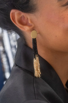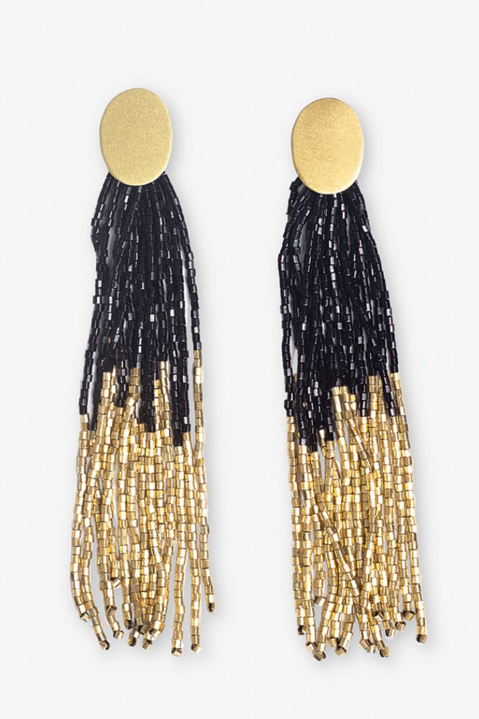 Add a touch of bohemian glamour to your look with the Mae Oval Brass Post 2-Color Beaded Tassel Earrings in striking black and gold. These stunning earrings feature a chic oval brass post, expertly crafted to provide a secure and comfortable fit for all-day wear. Cascading from the post are captivating beaded tassels made from black and gold beads. The beads are meticulously arranged to create a mesmerizing ombre effect.