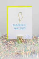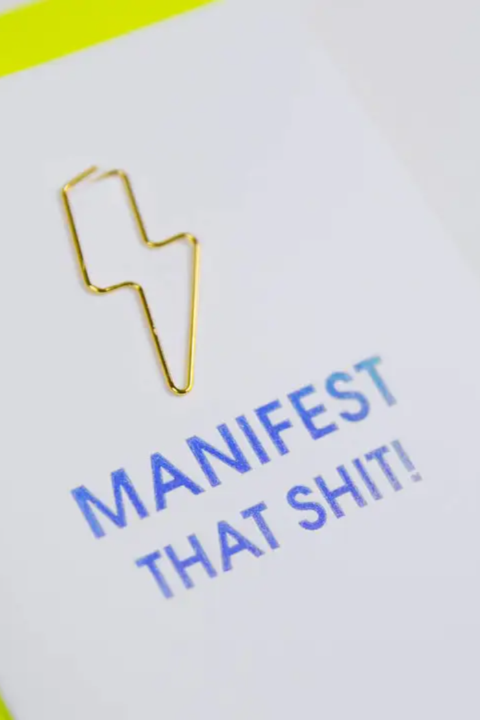 Our “Manifest That Shit” card is letterpress printed on a vintage printing press in sunny California. Featuring striking holographic silver foil on bright white paper, this card comes paired with a neon yellow envelope and includes a reusable gold lightning bolt paper clip—perfect for holding cash, a gift card, or saving as a keepsake.