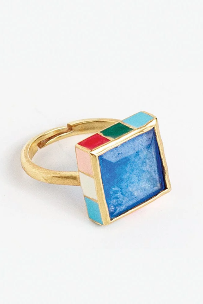 Elevate your look with the Marlowe Square Stone with Colorblock Enamel Border Ring. This cocktail ring features a square-shaped stone with color-blocked enamel stripes around the edge, creating a unique and eye-catching design. It adds a stylish and fashionable element to your ensemble.