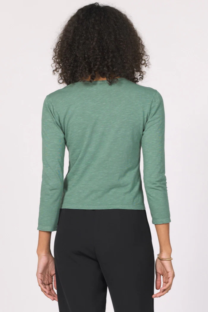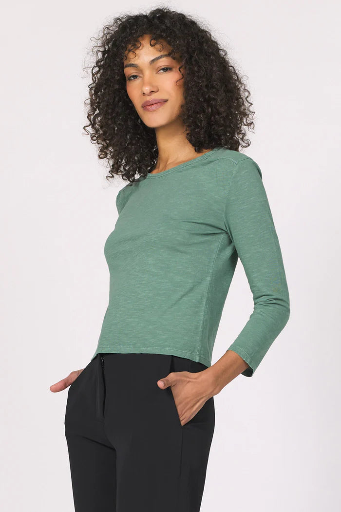 Embrace effortless Melina slub top, the long-sleeve crew neck top features exquisite shirring details, offering a touch of sophistication to any wardrobe staple. Its versatile design makes it a perfect choice for both dressed-up occasions and laid-back gatherings, pairing it with tailored trousers for a chic office look or with your favorite jeans for a stylish, casual outing.