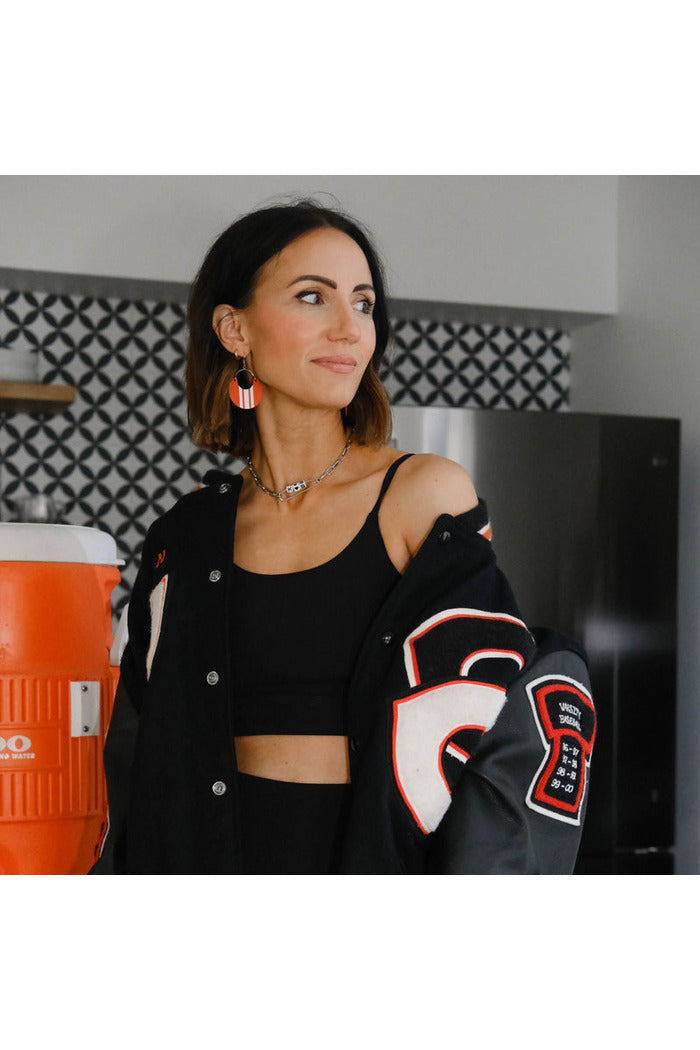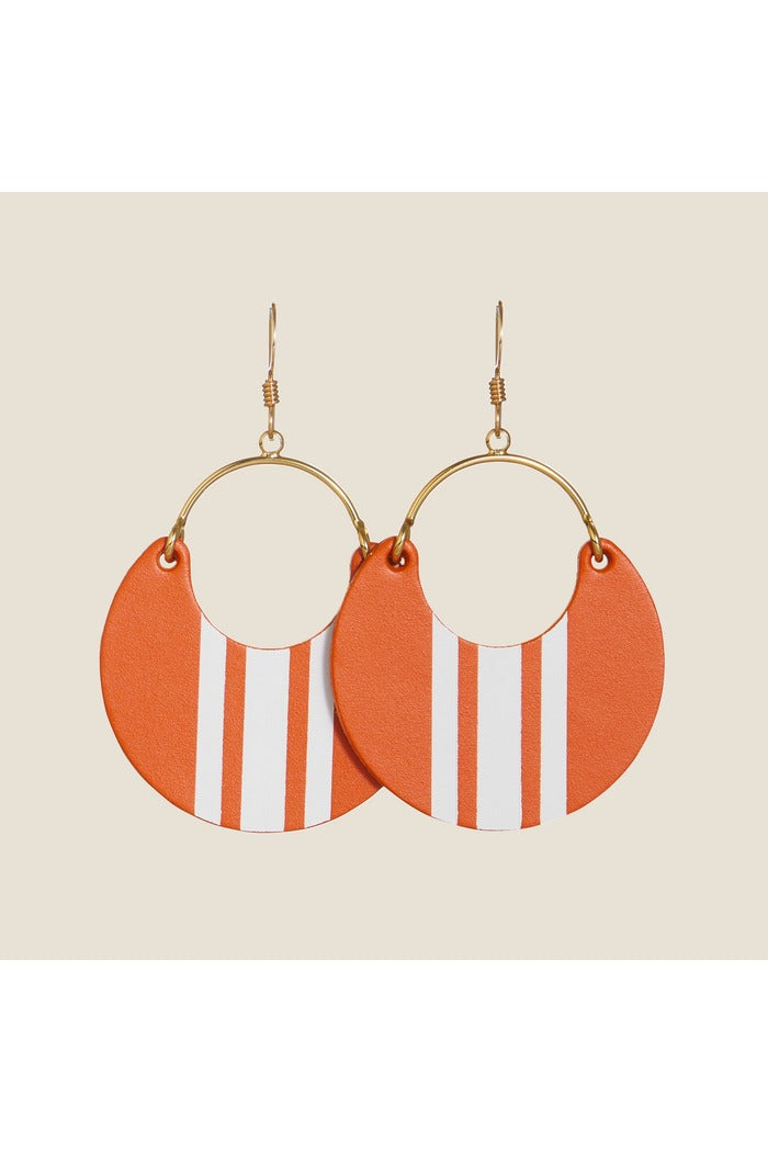 These stunning earrings are handmade from premium smooth orange leather and are designed with a sporty twist, featuring three sleek white hand-stamped stripes down the center of the earring. Available on gold or silver hardware, they are versatile and can be paired with any outfit for a pop of color.