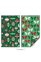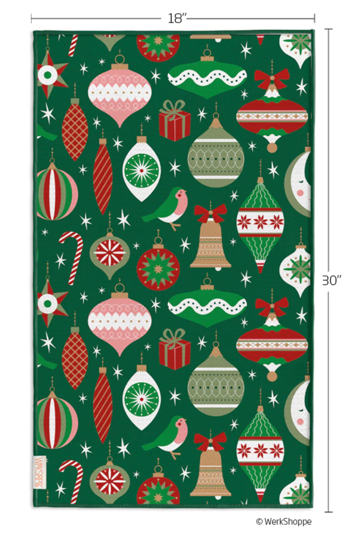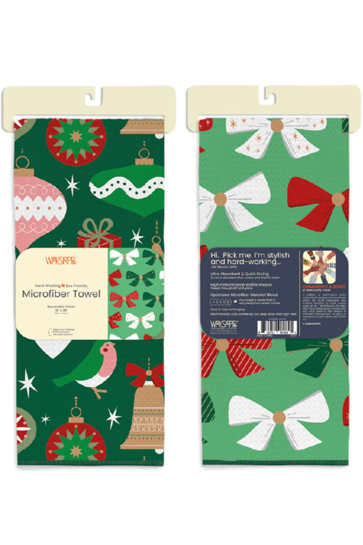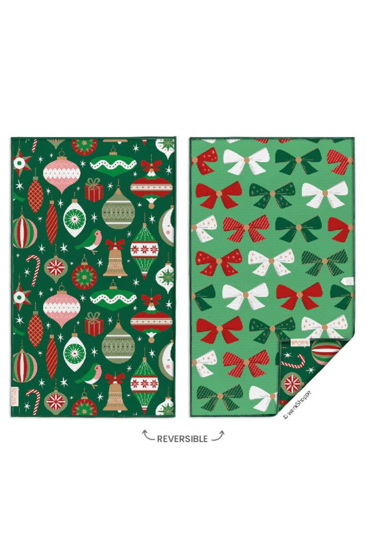 This reversible microfiber kitchen towel features an assortment of vintage tree ornaments on one side and coordinating holiday bows on the other.