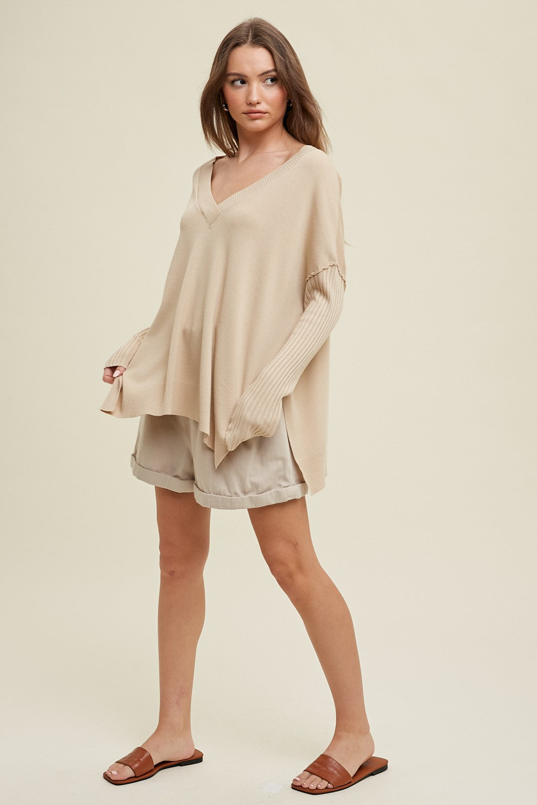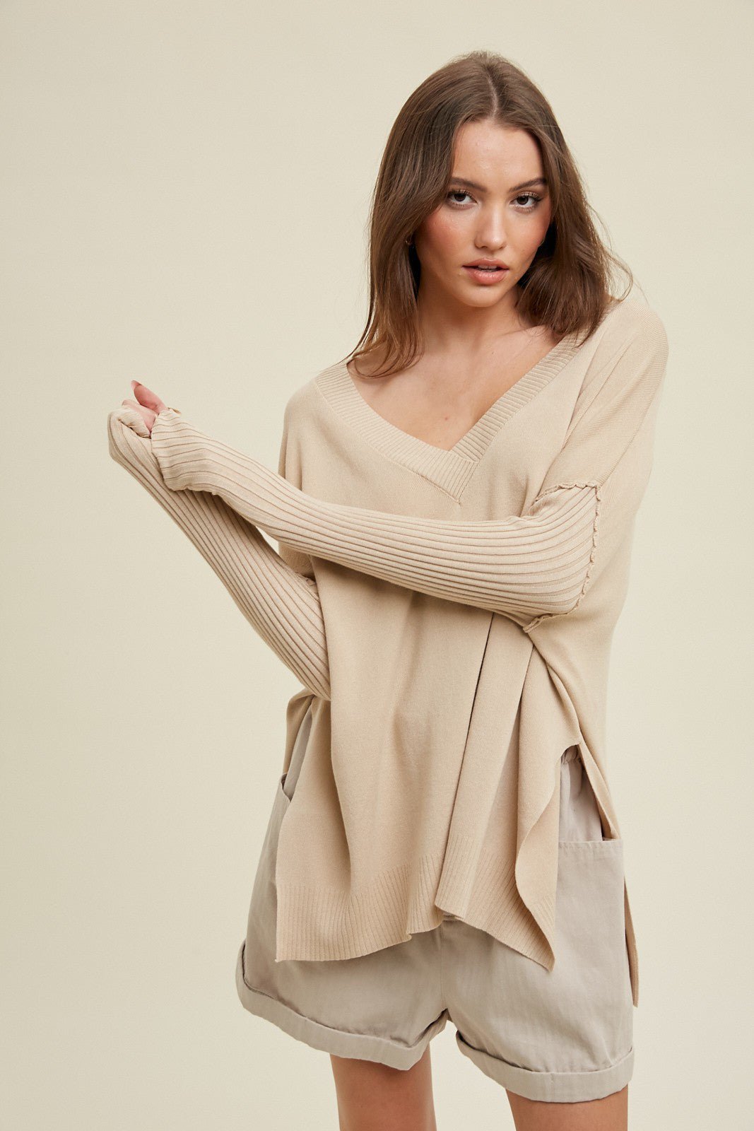 Oversized v-neck sweater with ribbed sleeve detail, and cute side slits. Great transition to spring sweater.