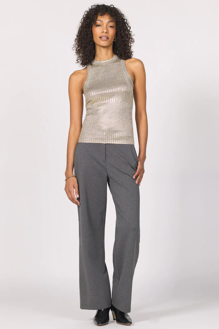 Shimmer and shine with Pamela rib metallic tank top. This sleeveless beauty makes a statement with its foil finish, adding a touch of glam to any outfit. This versatile slim fitting tank is perfect for layering or wearing on its own, quality and flair in every wear.