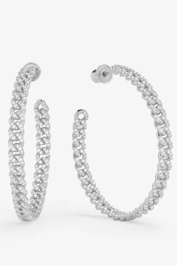 Command the spotlight with the Pavé Julian Chain Hoops in a stunning 2-inch diameter. These bold earrings redefine modern glamour, merging chunky Cuban-inspired links with the brilliant sparkle of hand-set simulated diamonds. Designed for those who love a large statement piece, the contemporary chain silhouette offers an edgy yet elegant finish that elevates any formal or classy casual ensemble. The high-shine silver plating ensures a luxury feel, making these oversized hoops a must-have for your trendy aesthetic collection. Whether you are dressing for the red carpet or adding fine detail to a street-style look, these hoops deliver classic confidence. Explore the full texture and shine of our Julian collection or find your next favorite pair by visiting the hoop shop.