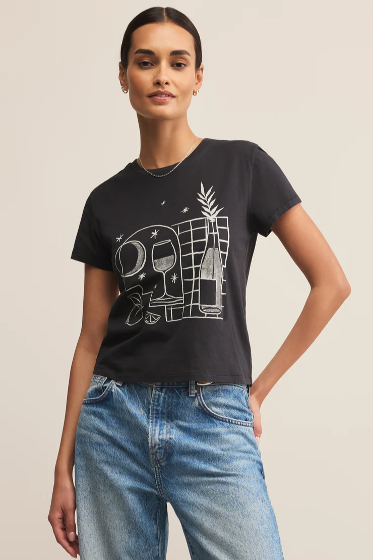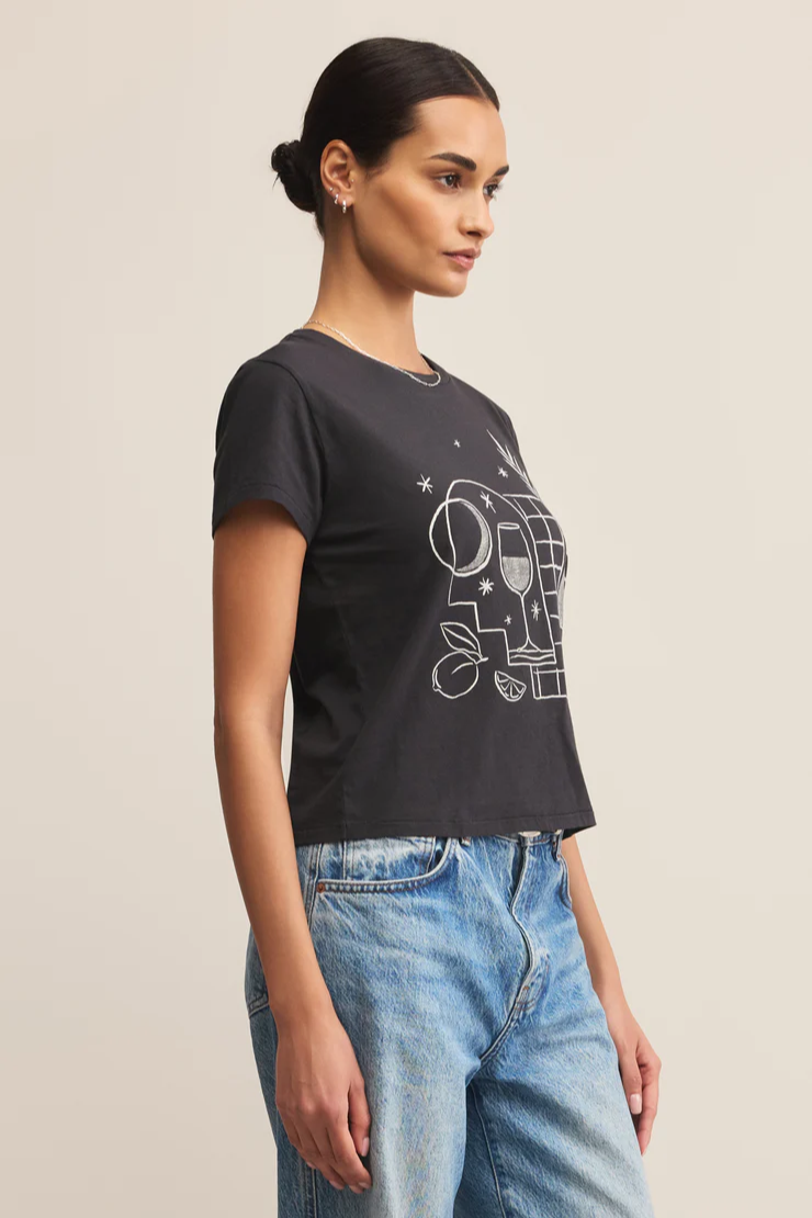 This short sleeve crew neck tee features a playful picnic scene screen print that adds a fun touch to your everyday lineup. Crafted from soft-hand, loose knit cotton jersey with an enzyme wash, it has a relaxed fit that feels easy, breezy, and made for laid-back days.