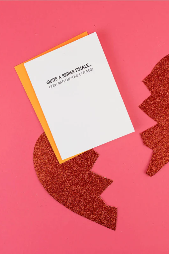 Our "Quite A Series Finale ... Congrats on Your Divorce" card is letterpress printed on a vintage printing press in sunny California.