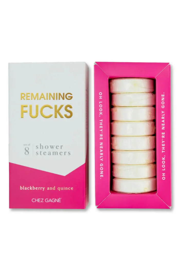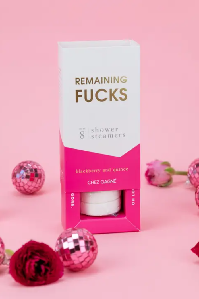 The Remaining Fucks Blackberry Quince Shower Steamers are here for the days when you’re running on empty. Infused with essential oils, these steamers fill your shower with the bold, liberating scent of blackberry and quince — the perfect way to wash the BS down the drain and come back to life. Clean, vegan, cruelty-free, and made in the USA, this cheeky set makes everyday self-care feel rebellious in the best way. Packaged in a bold, gift-ready box, they’re a customer favorite for wellness shops, gift retailers, and modern boutiques looking for under $30 self-care with personality.