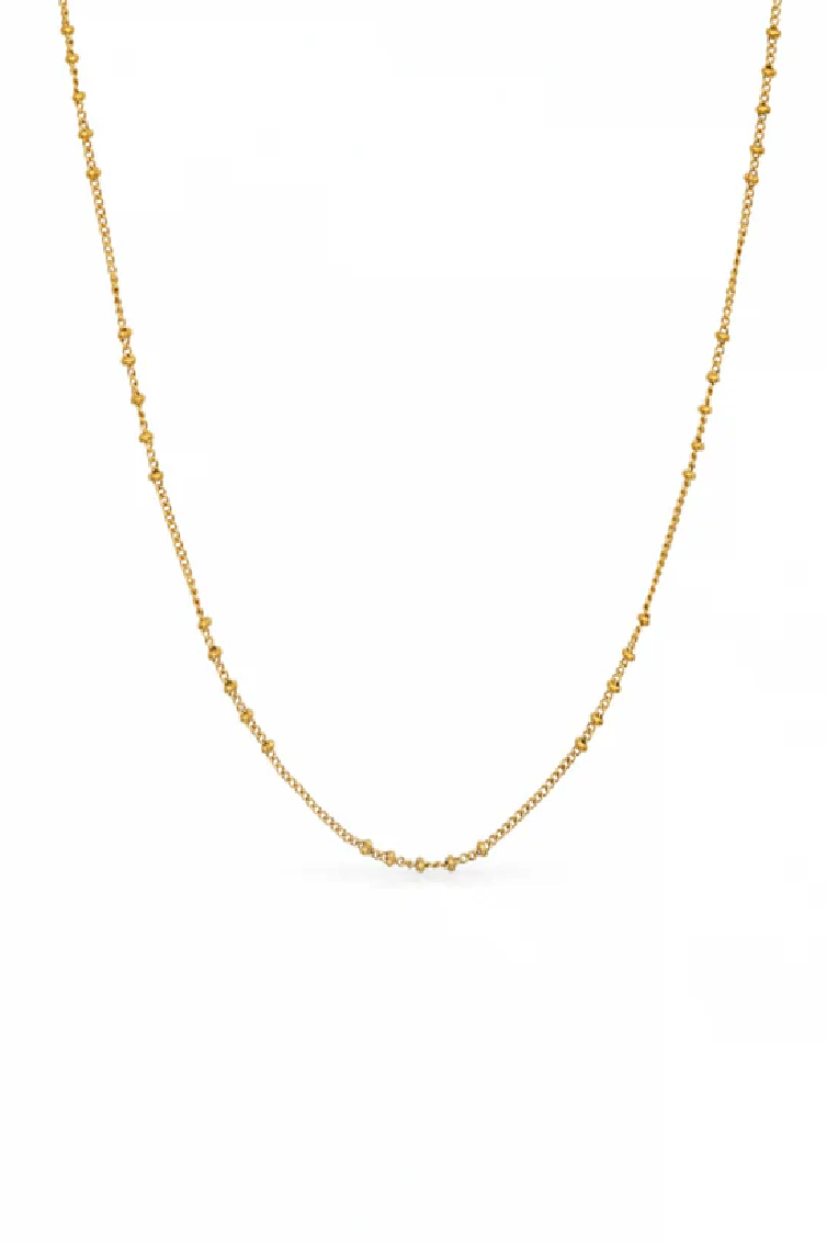 The Remi Necklace is a refined essential designed for effortless, everyday elegance. Crafted in 18k gold plating, this delicate satellite chain features subtle polished bead accents spaced evenly along a fine gold-toned chain, creating a soft, luminous shimmer with every movement. Minimal yet timeless, the Remi Necklace is perfect worn alone for a clean, understated look or layered with your favorite chains for a modern, curated stack. A versatile piece made to elevate both casual and elevated styles.