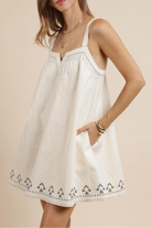 Wander with ease in this effortlessly romantic mini dress by SAGE THE LABEL. Crafted from soft cream cotton and accented with intricate black embroidery along the hem, it exudes timeless charm and easy femininity. The flattering babydoll silhouette is enhanced by wide straps with a chic V-notch neckline and dainty bow ties at the back. Finished with a side zipper, full lining, and practical side pockets, it’s the perfect blend of comfort and grace.