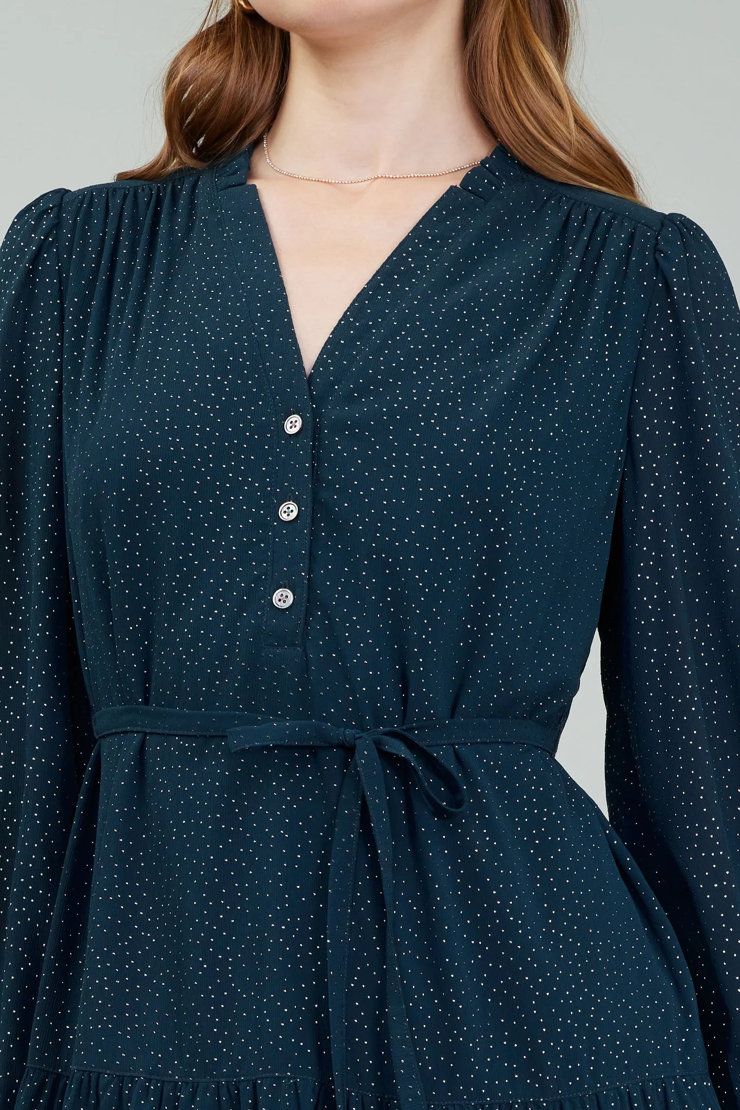 Feminine charm meets playful elegance in this deep teal mini dress. Featuring all-over studs, a flirty tiered skirt, and ruffle details, it offers effortless style. The split neckline, buttoned front, and optional self-tie belt add versatility, while long sleeves provide a touch of sophistication.