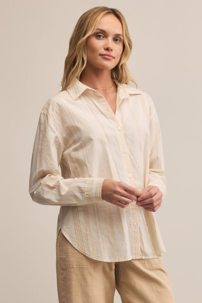 Breezy, lightweight, and endlessly wearable, this striped airy cotton button-up brings an easygoing feel to a timeless silhouette. With a relaxed fit and classic collar, it’s a go-to layer for warm, laid back days.