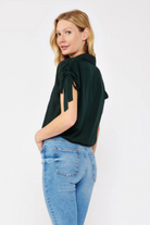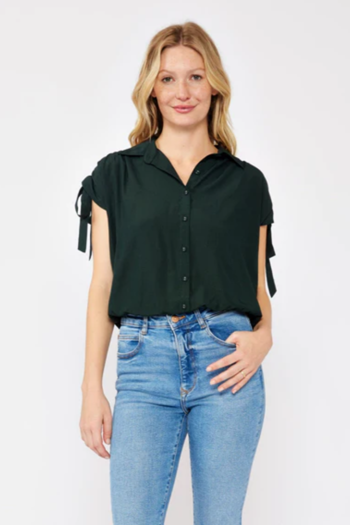 A versatile top that will instantly become your go-to for the office and casual outings. This elegant yet casual piece is crafted in a trendy cropped length and features a convenient button front, collared neckline, and comfortable dolman sleeves with ruched detailing. It's a unique twist on the classic button-up top, reimagined with a comfortable elastic hem and playful details.