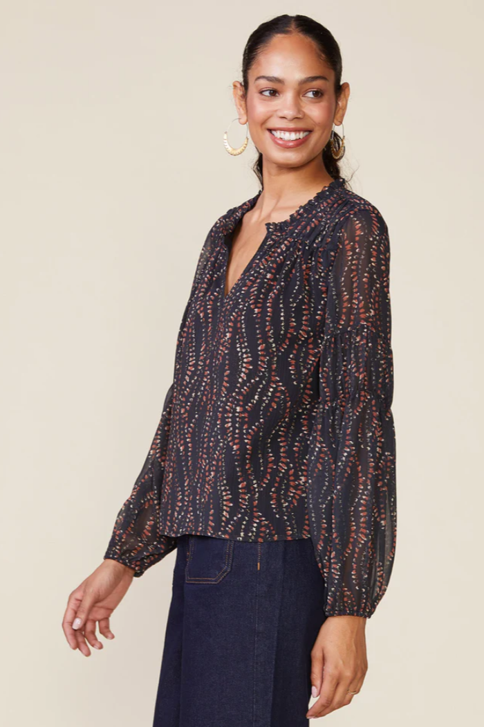 This long sleeve, airy statement blouse is made of an intricate foil print for just the right amount of shimmer. Easily worn from day to night, this blouse features an open neckline, ruffle accents and sheer sleeves.