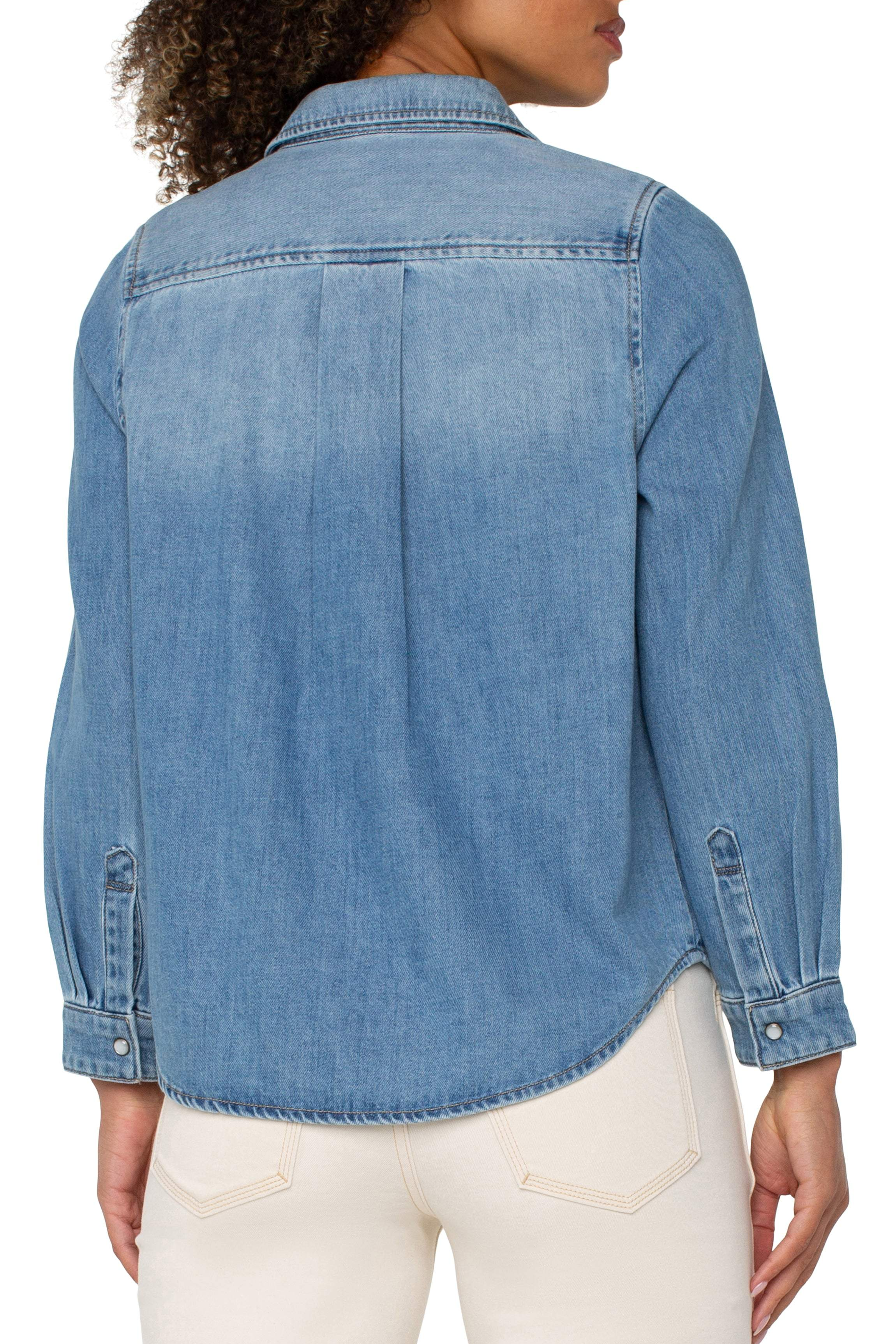 Our button-down denim shirt features pearlescent buttons making it an easy-to-wear piece that can be easily dressed up or down!