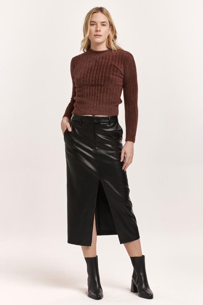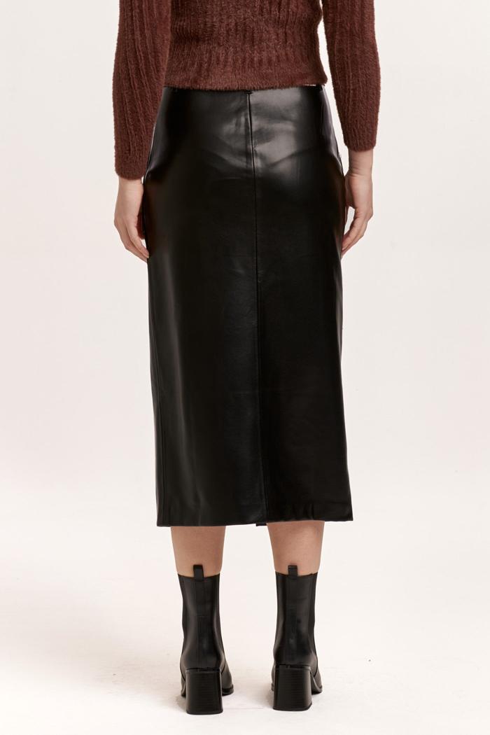 Ballerina length skirt in vegan leather. Detailed sophistication, crafted for lifestyle leisures, sits slightly below waist and straight fitting from the hip through sweep. Skirt inseam on vegan leather accented with side slant pocket, center front slit & hook 'n' eye waistband.