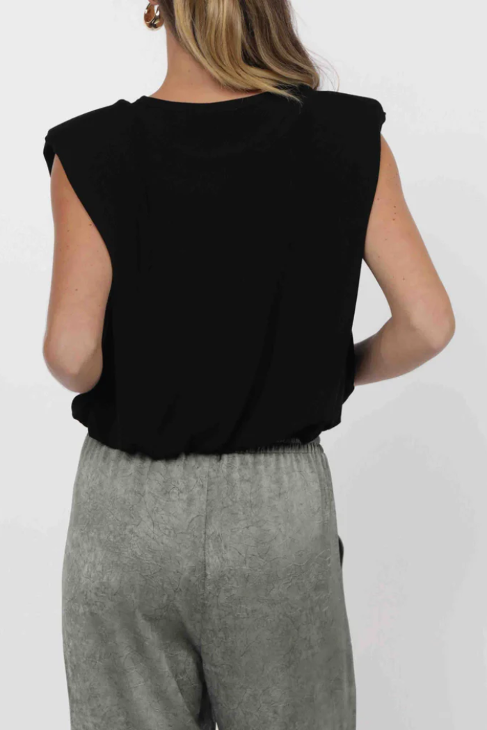 Meet your new power piece. The **So Into You Shoulder Pad Top** by Sage The Label delivers effortless confidence with a sleek, sculpted silhouette. Designed in a soft, stretchy knit, this sleeveless top features bold shoulder pads that add structure and definition, while the elastic hem creates a flattering, tucked-in effect without the fuss.