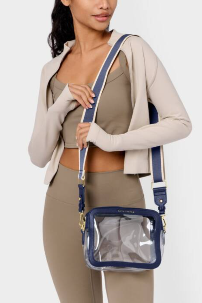 Our Stadium Bag in Midnight Blue is made from durable PVC and stylish vegan leather trims, making it the perfect stadium-approved accessory for events and festivals. The removable strap allows you to easily switch up your look with our Interchangeable Canvas Straps, or even coordinate the strap color with your favorite team on game day.