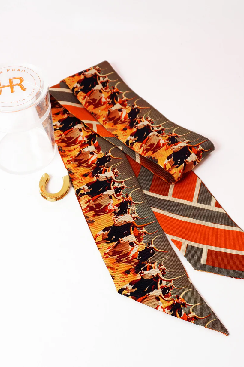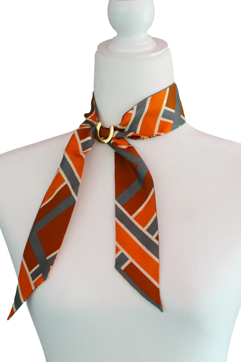 An elegant blend of tradition and modernity, the Hampton Road Silk Twillionaire Scarf Set includes a pure silk scarf and a gold-tone horseshoe-shaped scarf ring, thoughtfully packaged in a sleek acrylic tube for gifting or display. Inspired by classic equestrian motifs and timeless Americana, the scarf features a signature Hampton Road print on luxurious silk twill. Its slim, elongated silhouette is perfect for styling around the neck, wrist, hair, or handbag.