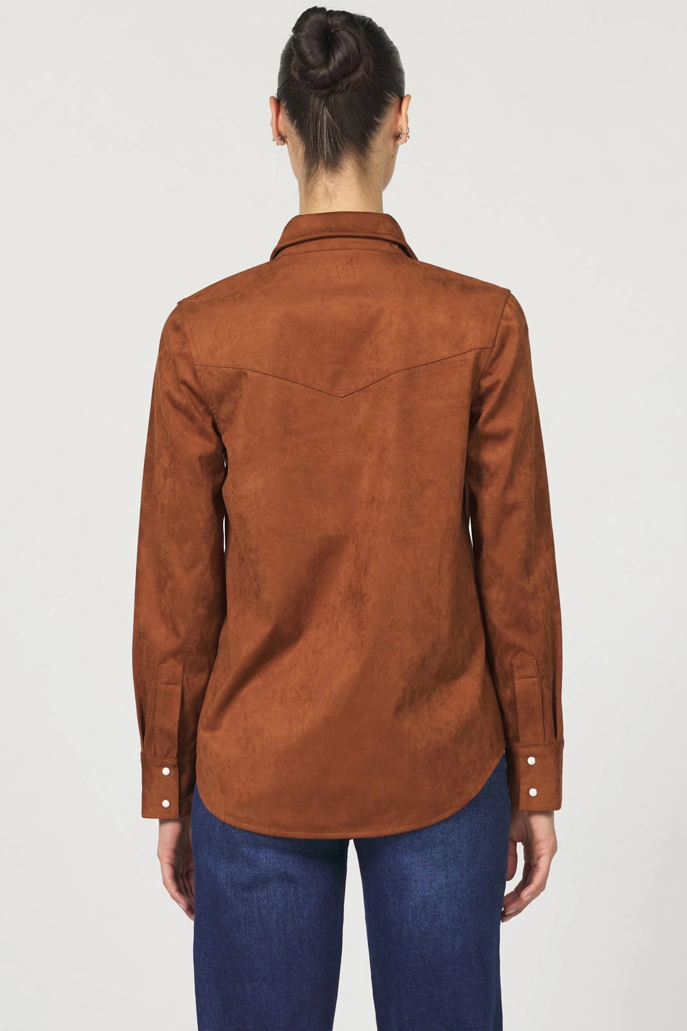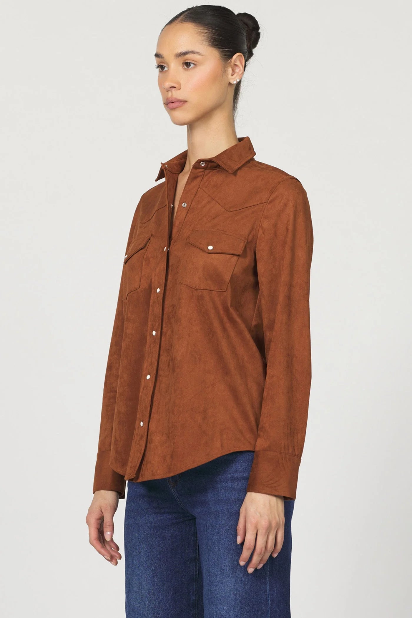 Star shirt is the blend of style and comfort with this suede long sleeve button-up in a rich chocolate hue.
