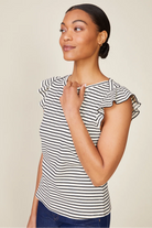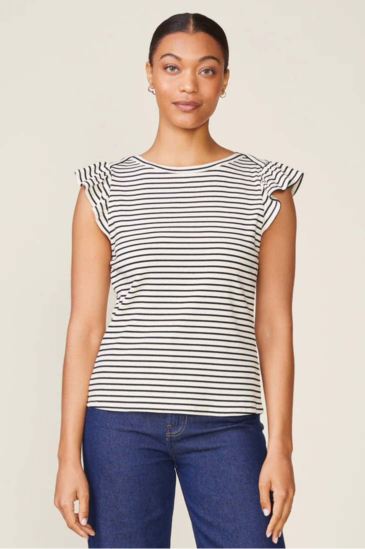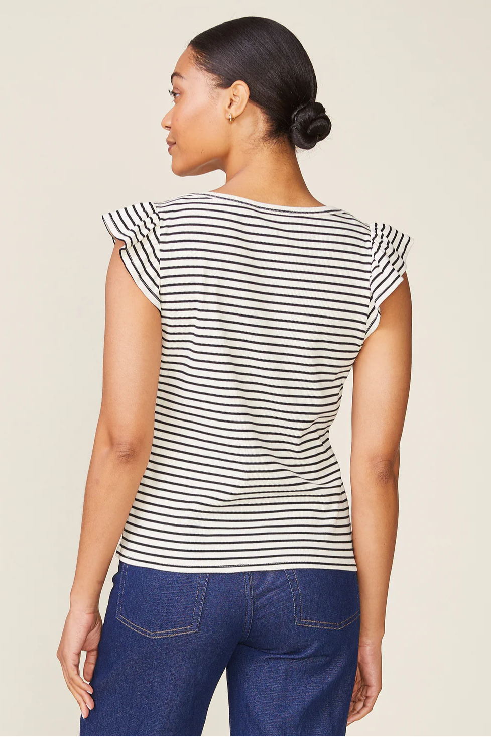 This stripe ribbed flutter sleeve knit is the kind of purchase you never regret. Femme touches at the sleeve and shoulder, in a classic color combo that never disappoints.