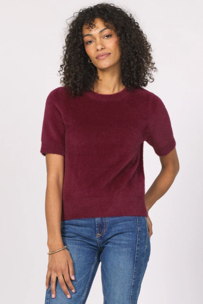 Susie short sleeve crew neck top crafted from a soft blend of fuzzy yarns. This comfortable classic fit with its lightweight design, making it a versatile addition to any wardrobe. Perfect for layering or wearing on its own, it's the ideal choice for a polished yet chic style.