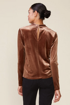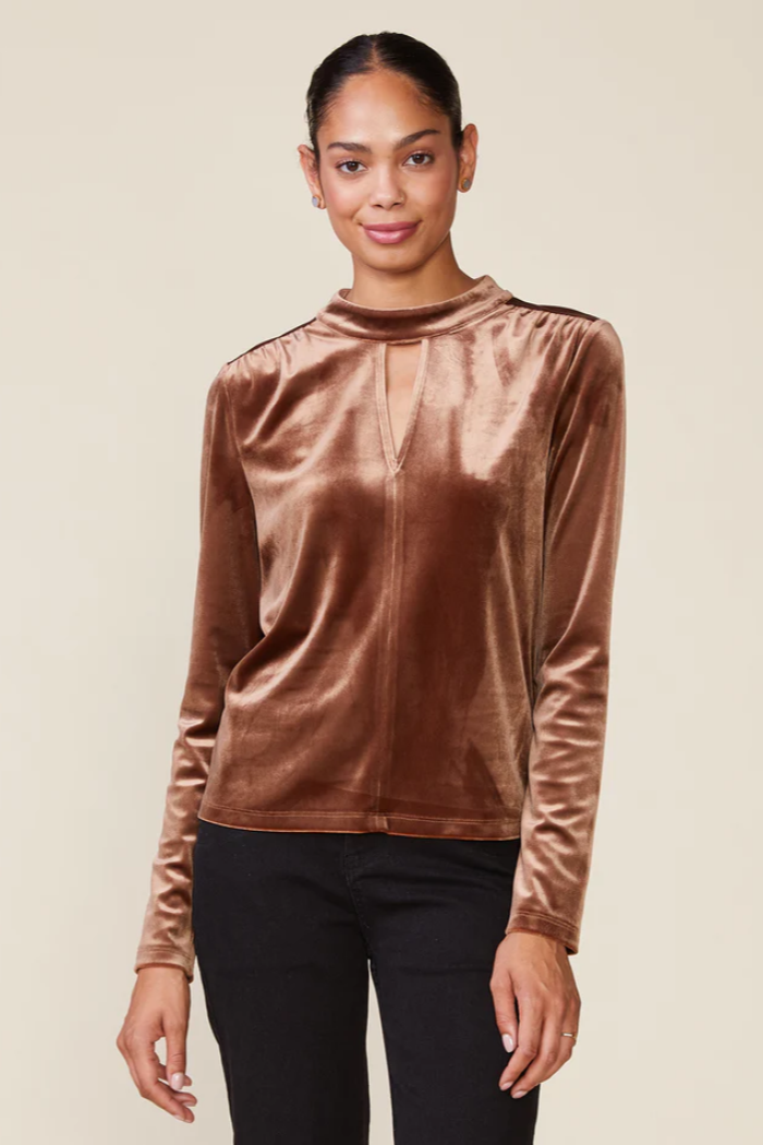 This long sleeve mock neck top with a triangular front keyhole is crafted in stretch velvet. It is the perfect canvas for a stunning holiday look. Both effortless and elegant, it doesn’t get any easier than this party ready top.