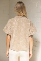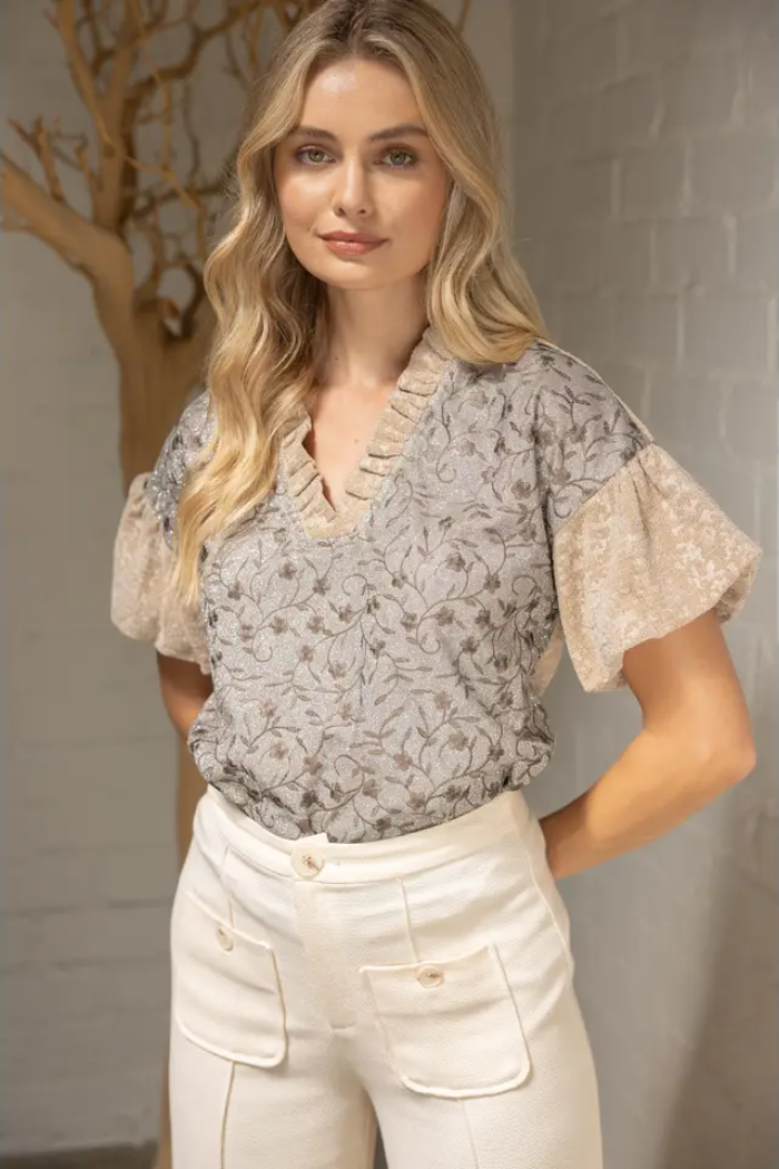 Taupe jacquard floral top with metallic shimmer, featuring a V-neckline with ruffle trim and flared short sleeves. A blend of vintage-inspired elegance and modern style, perfect for both casual and dressy occasions.