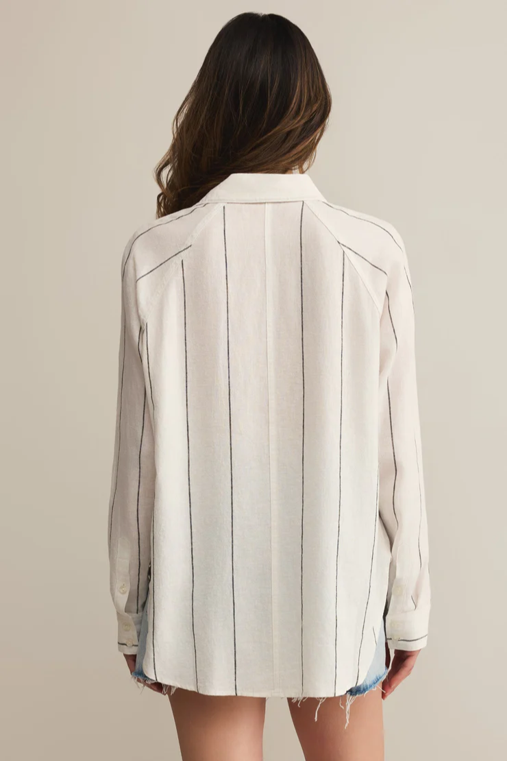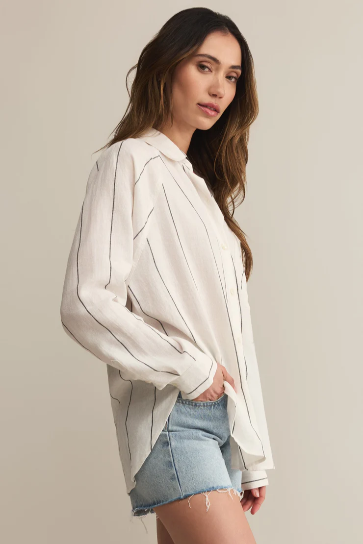 You'll love the easy, breezy comfort of this classic stripe button-up. Featuring that soft, drapey feel you look for, you can wear it alone or as a lightweight layer for an effortless look, no matter where your day takes you.