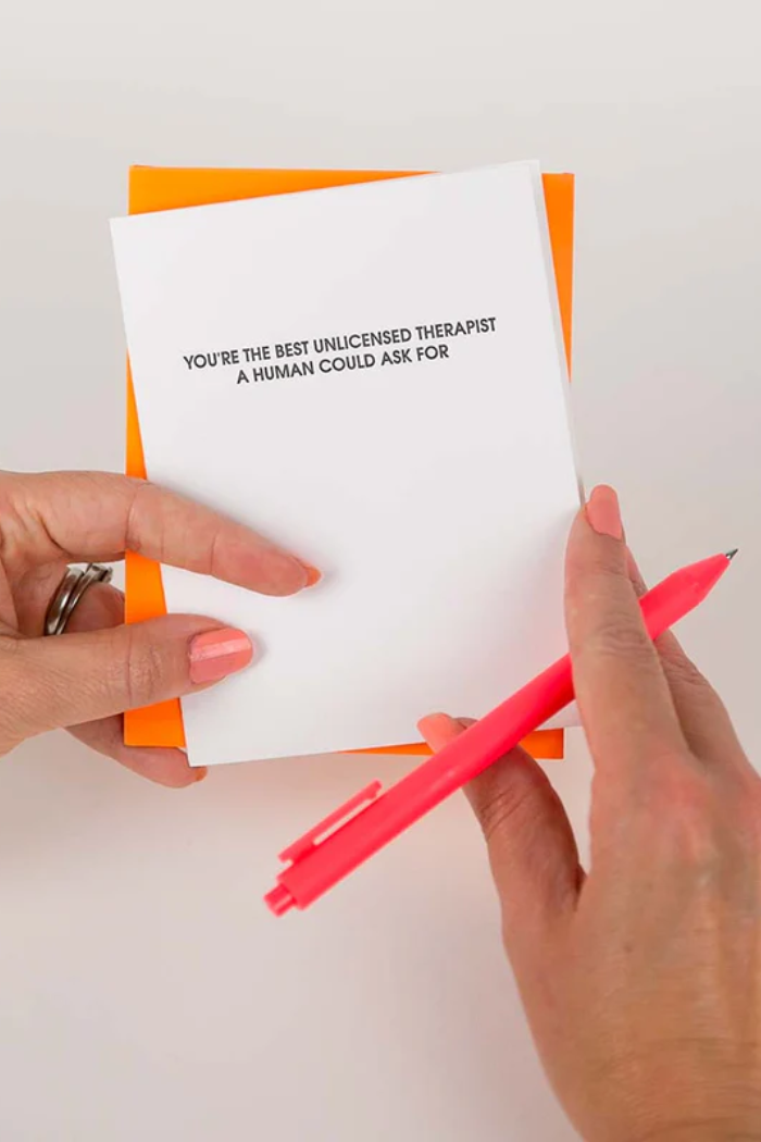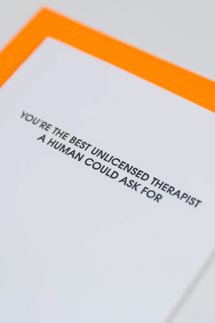 Our "You are the Best Unlicensed Therapist a Human Could Ask For" card is letterpress printed on a vintage printing press in sunny California.
