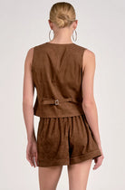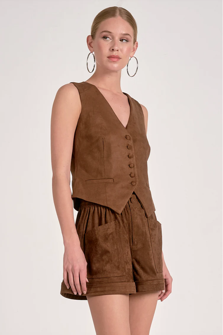 The Valentina Vest in Chocolate is a refined suede layering piece designed to elevate your look with effortless polish. Rendered in a rich, warm brown tone, its soft, textured finish adds depth and dimension while maintaining a sleek, tailored silhouette. Perfectly paired with the matching suede shorts or styled on its own, this vest brings a sense of modern sophistication and understated luxury, ideal for creating a cohesive, style-forward ensemble with ease.