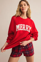 Made from mid-weight cotton fleece, this oversized sweatshirt delivers warmth and softness from the first wear. A statement “Merry” graphic in boucle applique gives it a festive finish, designed to stand out in her seasonal rotation.