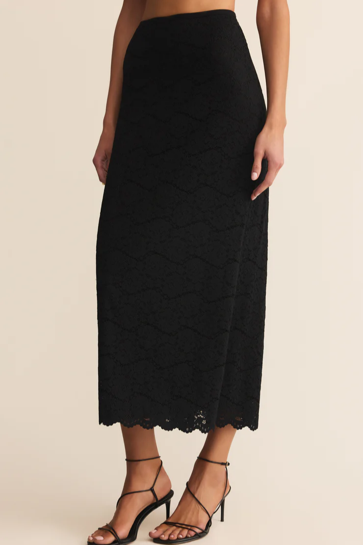 Designed in stretch floral lace with a comfortable elastic waistband, this high-rise midi offers texture and polish in equal parts. The scalloped hem adds just the right touch of romance, whether dressed up or down.