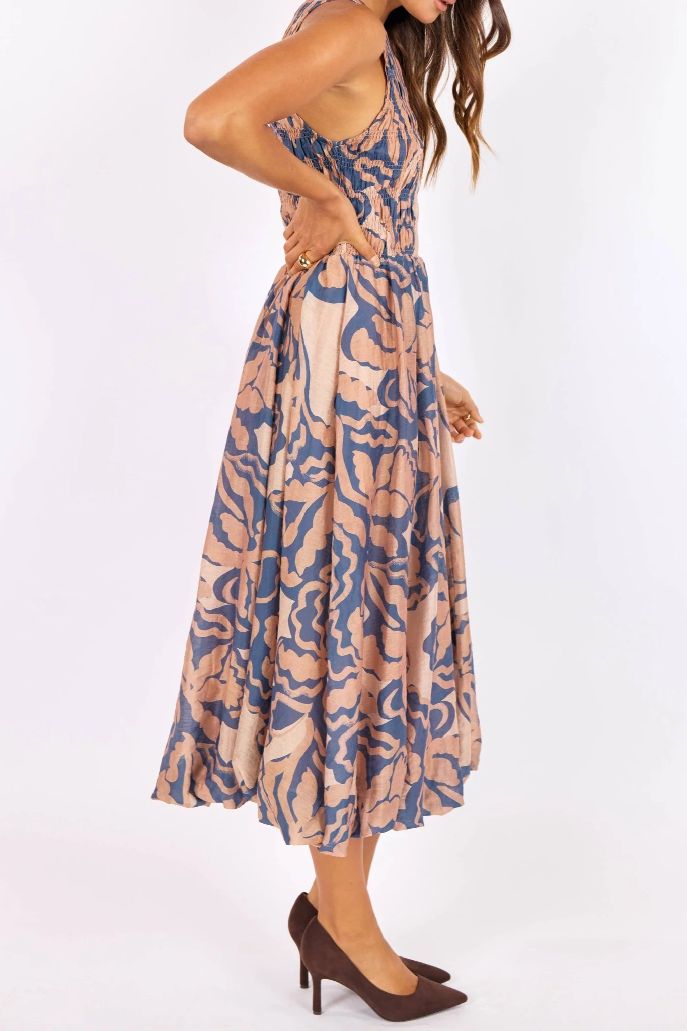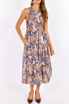 The high round neckline offers a clean, modern finish, while the fully smocked bodice creates a comfortably contoured fit that moves with you. A delicate keyhole back with button closure adds a subtle feminine detail, and yes, there are functional side seam pockets (because we love a dress that does it all). The gathered bubble hem brings soft volume and shape, finishing at a chic mid-calf length for that perfect midi moment.