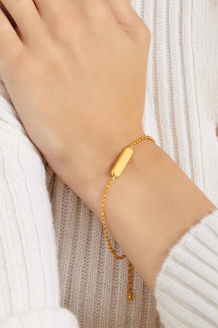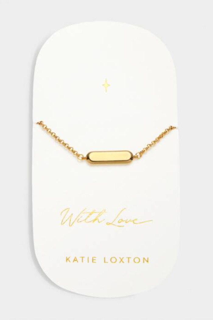 Certified waterproof, our 'With Love' Waterproof Gold Signet Bracelet has been designed in 18K Gold PVD Coating, which is waterproof, sweat-proof and life-proof. This gorgeous bracelet holds a minimal bar charm making it easy to wrist stack with other bracelets or wear solo. This style comes presented on a premium card that is printed with the golden sentiment,.