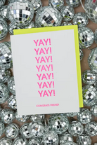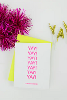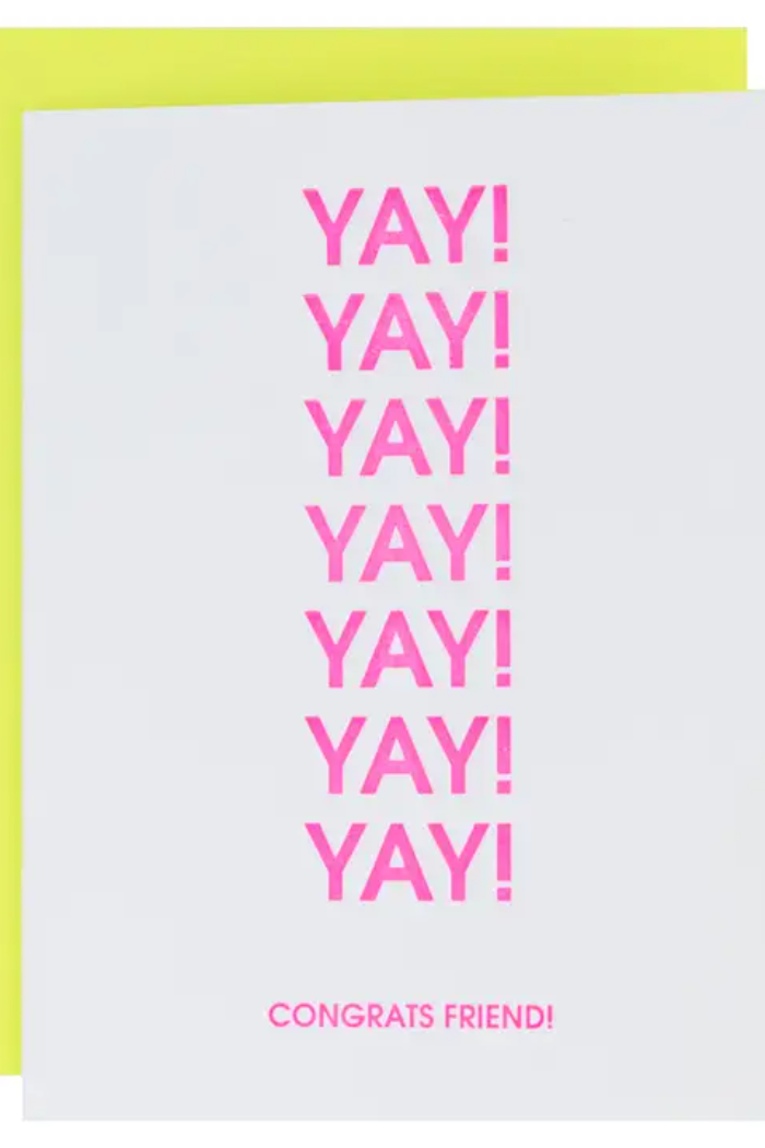 When one “Yay!” isn’t enough, send three. Our “Yay! Yay! Yay! Congrats Friend!” card is a bright, joyful way to celebrate your favorite people and their biggest wins. Perfect for graduations, engagements, new jobs, or any milestone that deserves extra cheer, this card brings the energy with bold neon pink ink and a sunshine yellow envelope.