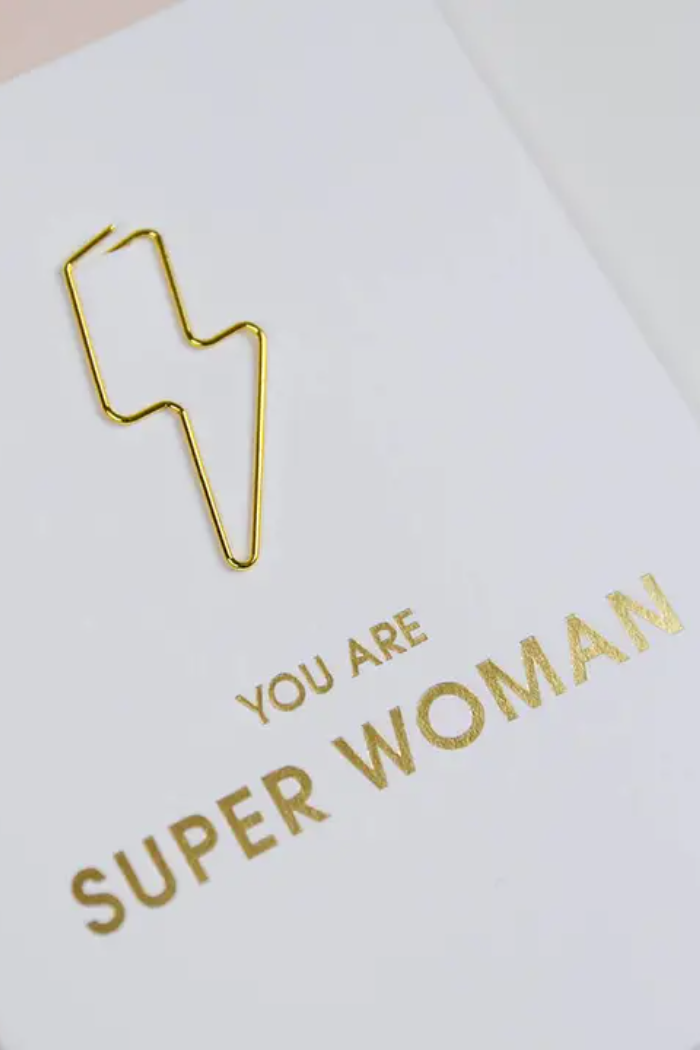 Letterpress printed on a vintage printing press, this card includes a heavy-duty lightning bolt-shaped paper clip, making it as functional as it is fun. The clip doubles as a gift card or cash holder inside the card, and afterward, it can be reused as a bookmark or paperclip—perfect for keeping your superhero energy close at hand.