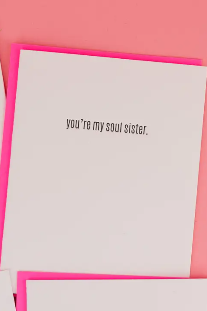 Our “You’re My Soul Sister” card is the perfect way to celebrate the ride-or-die bestie who just gets you. Whether it’s for Galentine’s Day, a birthday, or simply reminding your best friend how much they mean to you, this bold letterpress card says it all with style. A thoughtful gift for sisters by blood or soul.