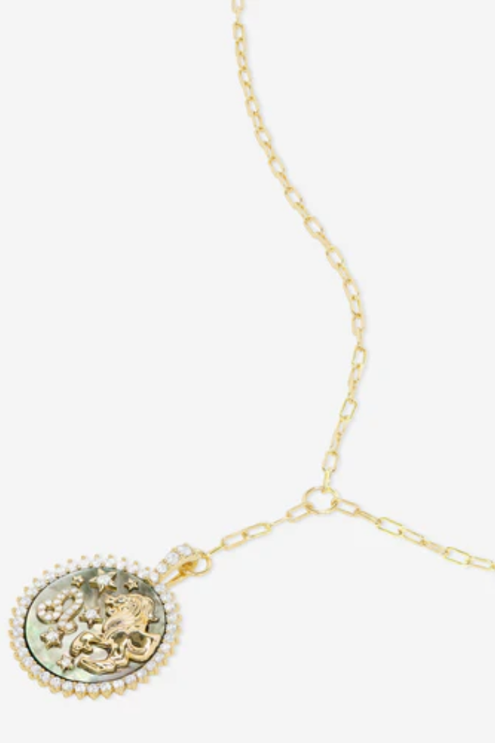 Who says the universe doesn't revolve around you? Our Zodiac Medallion Necklace makes it official. With celestial grey mother-of-pearl, shining simulated diamonds, and a reversible engravable back for whatever cosmic message you're feeling. Astrology never looked so good.